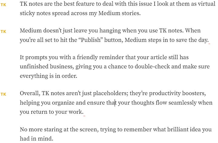 TK notes: Tackle those lengthy stories with ease, using TK notes helps you keep your writing on track.